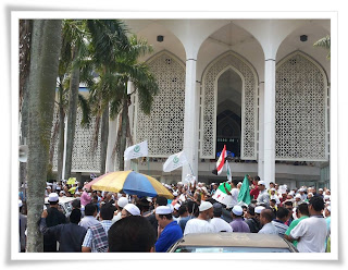 | Cikgu Kharuddin menyampaikan pidato ketika berhimpun secara aman di perkarangan Masjid Negeri Selangor, sebentar tadi. |